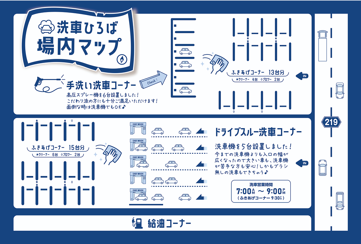 ドライブスルー洗車5台、手洗いスプレー洗車6台、拭き上げスペース28台の大型洗車場なので